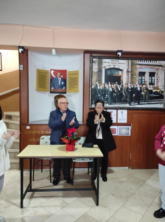 BİR VEFA ÖRNEĞİ ÖĞRETMENİM SINIFTA PROJESİ"24 KASIM ÖĞRETMENLER GÜNÜ"ÇOŞKUYLA KUTLANDI.Okulumuz öğretmenlerinden Cansu ERGÜN'ün her ikisi de emekli öğretmen anne ve babası,proje kapsamında okulumuzu ziyaret ettiler.Öğrenci ve öğretmenlerimizle sohbet ettiler. Perihan Tulan ailesi olarak emektar öğretmenlerimize çiçek ve plaket takdimiyle birlikte katılımlarından dolayı şükranlarımızı sunduk.